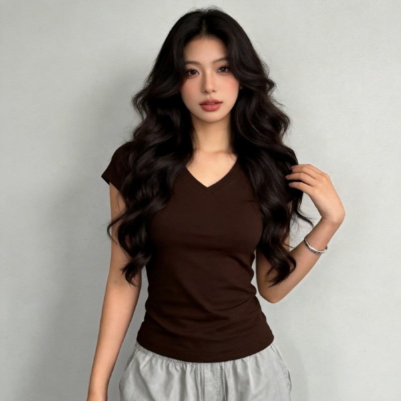 S107#220克女士大V领T恤高弹力91棉9氨纶