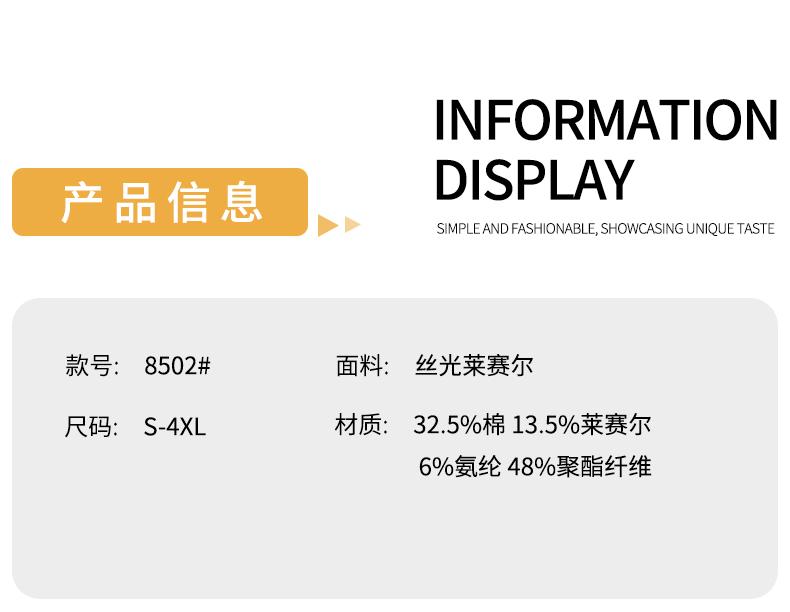 商品货号8502面料成分:32.5%棉13.5%莱赛尔6%氨纶48%聚酯纤维