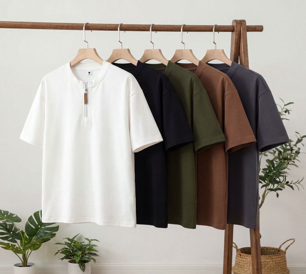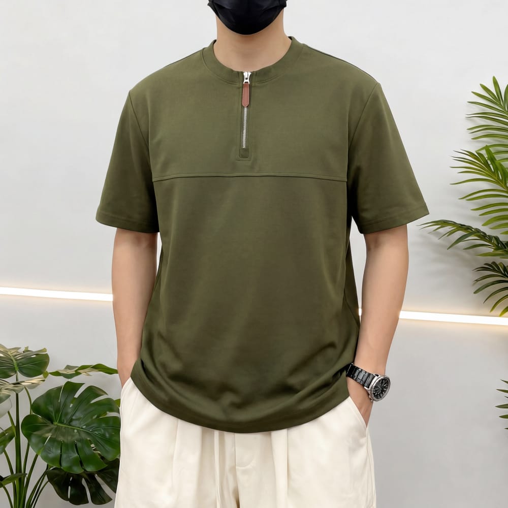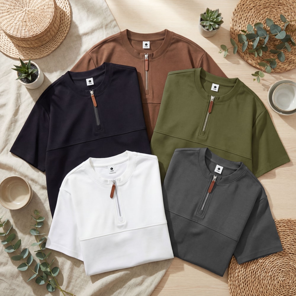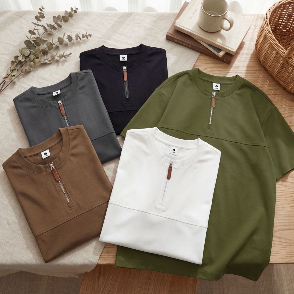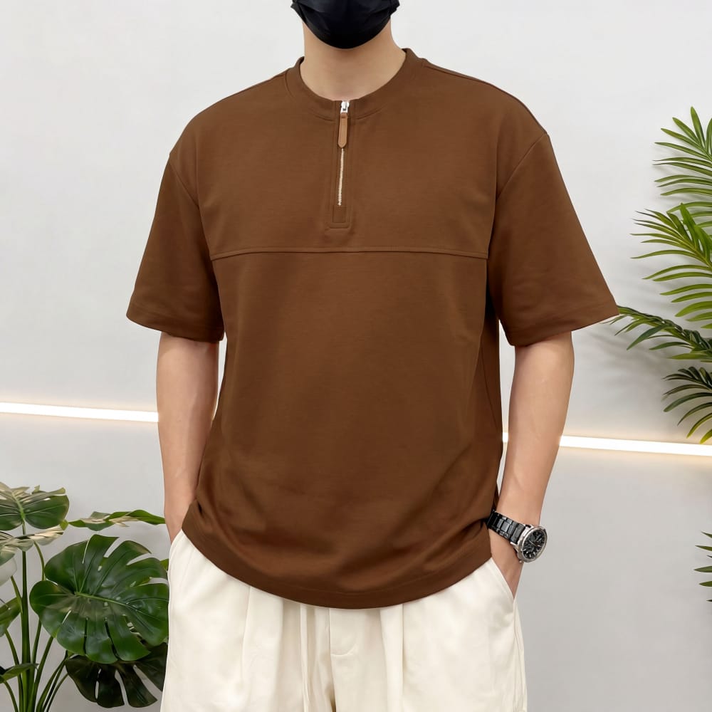 S7719#230克罗马丝光双面布潮牌半拉链宽松T恤